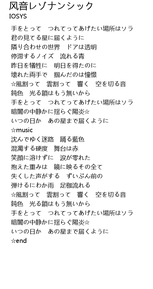 | [01:38.944] | 沈んでゆく迷路 踊る藍色 |