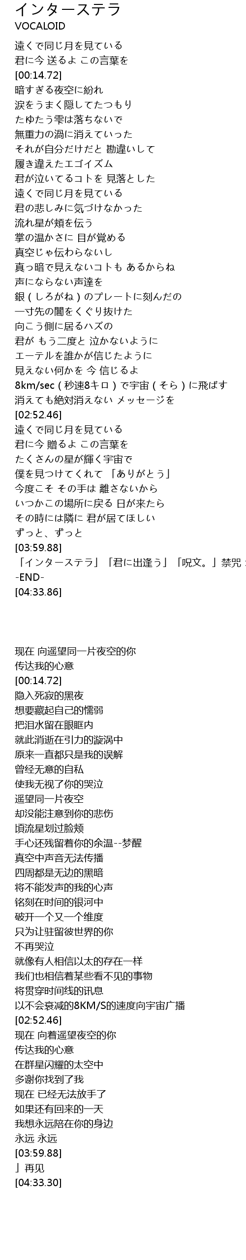 | [04:06.96] | 「インターステラ」「君に出逢う」「呪文。」禁咒:「インターステラ |