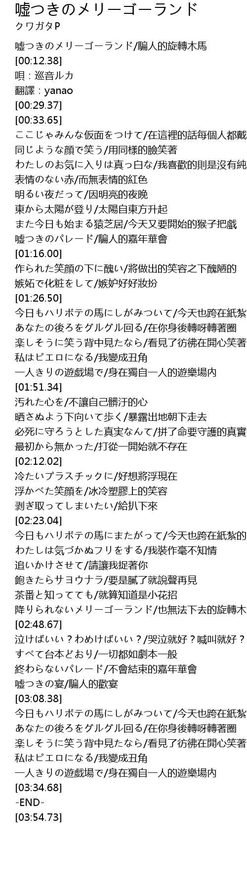 | [00:02.95] | 嘘つきのメリーゴーランド/騙人的旋轉木馬 |