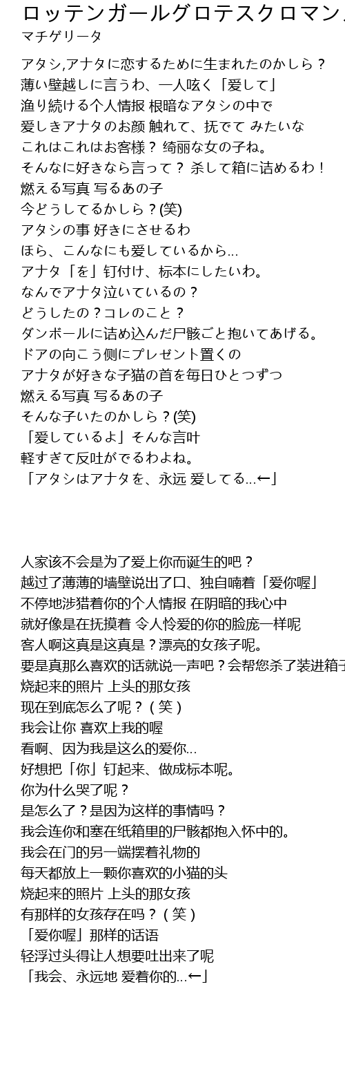 | [02:28:000] | ダンボールに诘め込んだ尸骸ごと抱いてあげる。 |