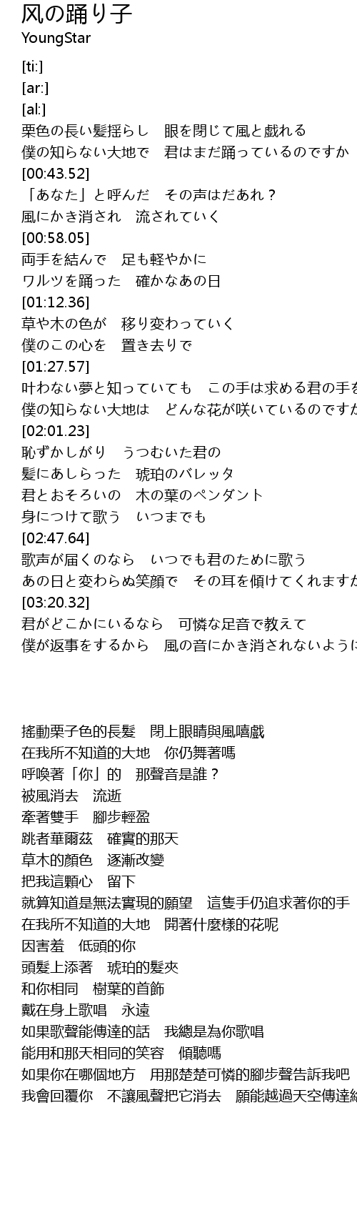 | [00:14.12] | 栗色の長い髪揺らし 眼を閉じて風と戯れる |