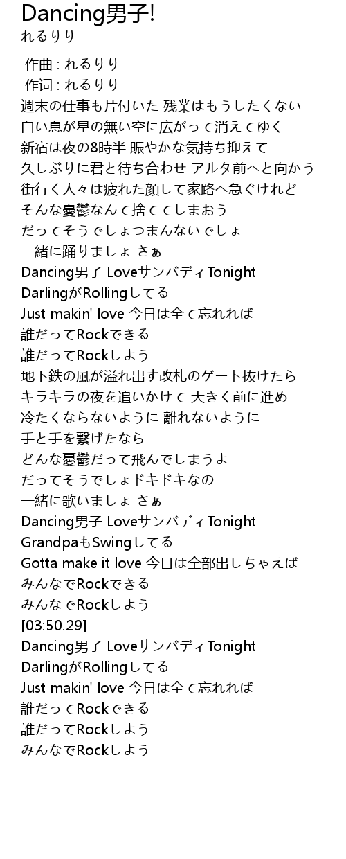| [01:31.91] | Dancing男子 LoveサンバディTonight |