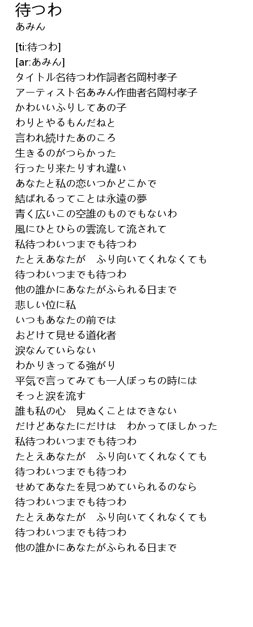 | [00:03.372] | タイトル名待つわ作詞者名岡村孝子 |
