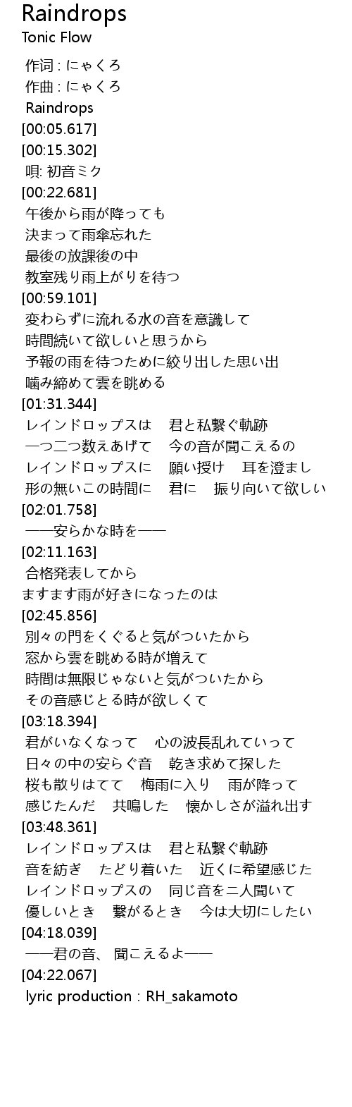 | [03:48.845] | レインドロップスは 君と私繋ぐ軌跡 |