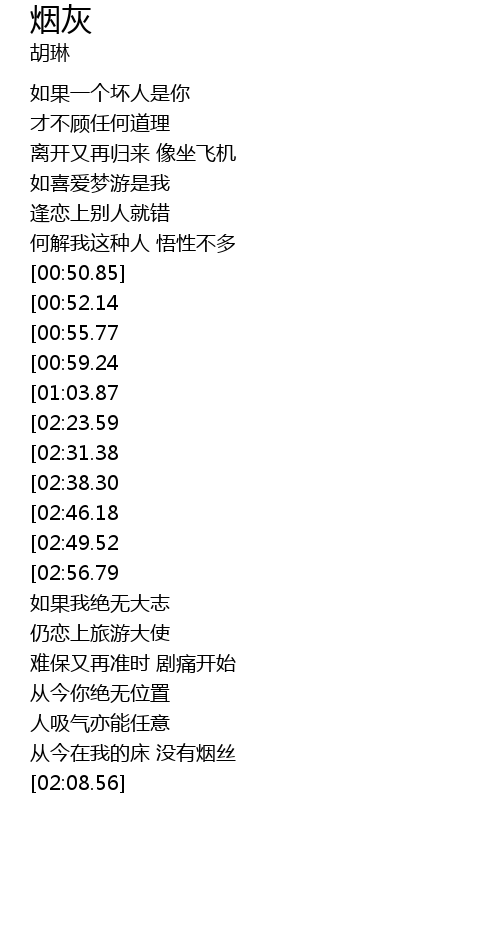 | [03:30.06][02:23.59][01:06.06] | chú qù yān huī wàng huái hòu huǐ |
