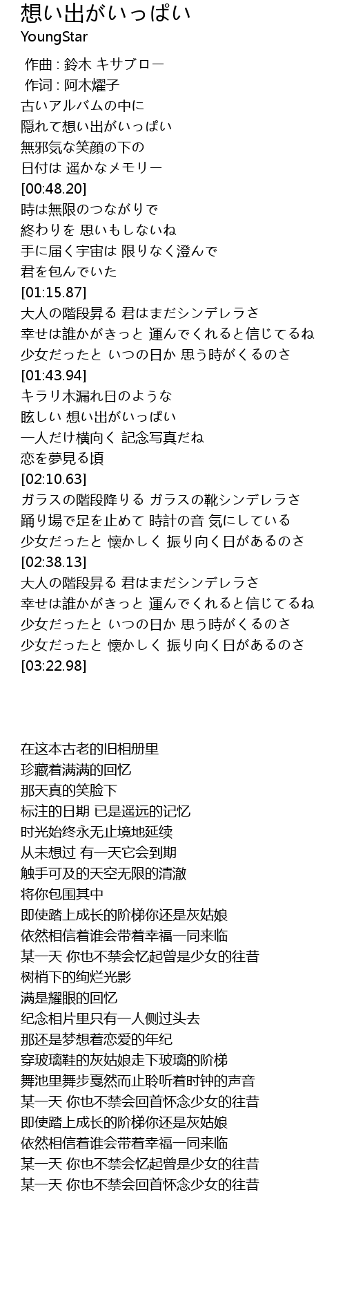 | [01:50.68] | 眩しい 想い出がいっぱい |