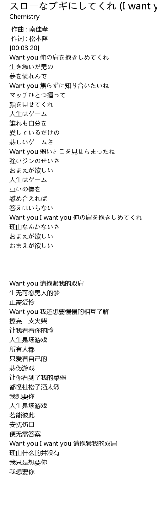 | [00:04.22] | Want you 俺の肩を抱きしめてくれ |