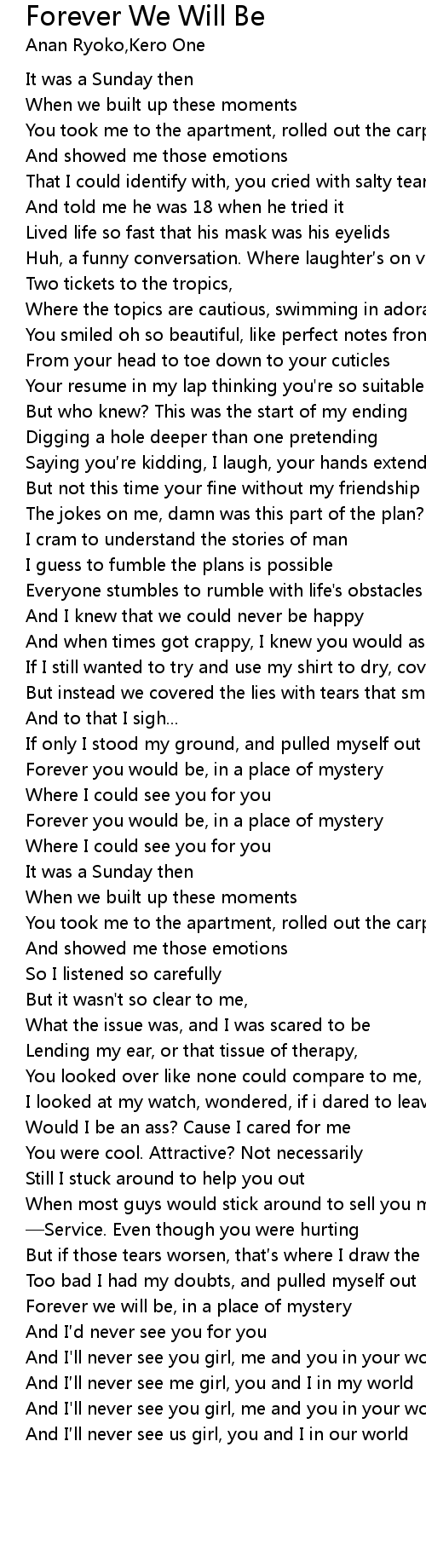 | [03:24.140] | Forever we will be, in a place of mystery |