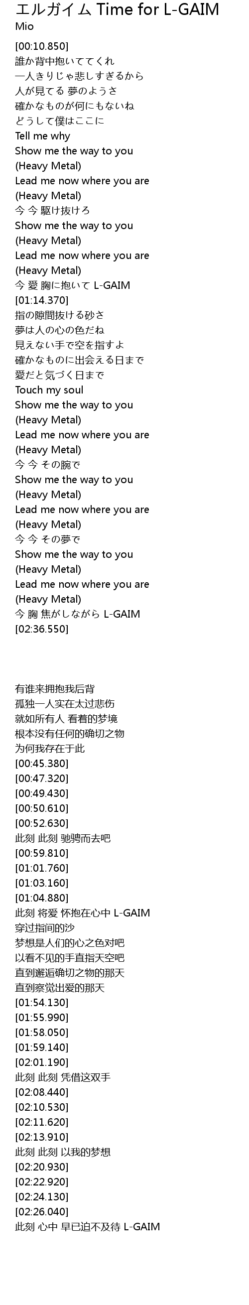 | [02:26.560] | 今 胸 焦がしながら L-GAIM |