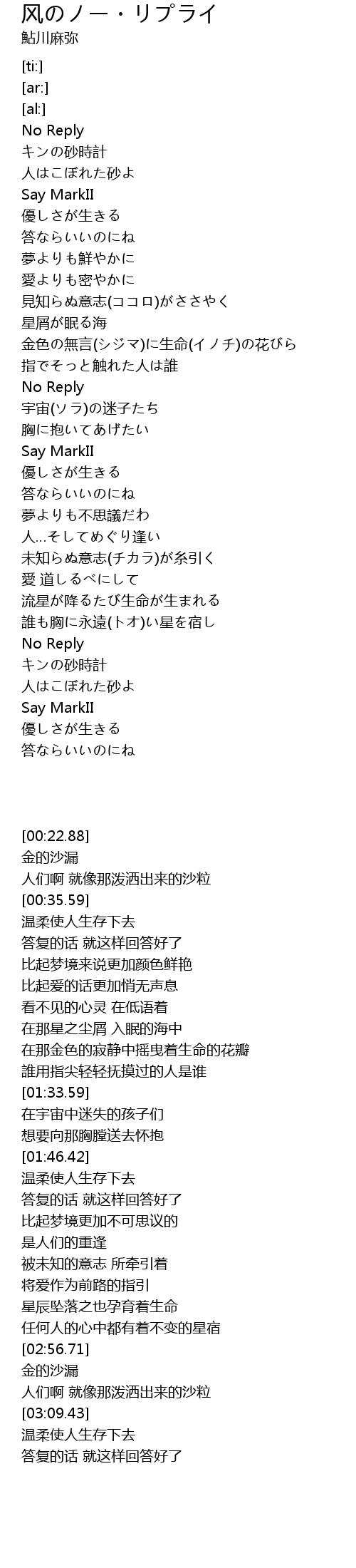 | [01:17.44] | 金色の無言(シジマ)に生命(イノチ)の花びら |