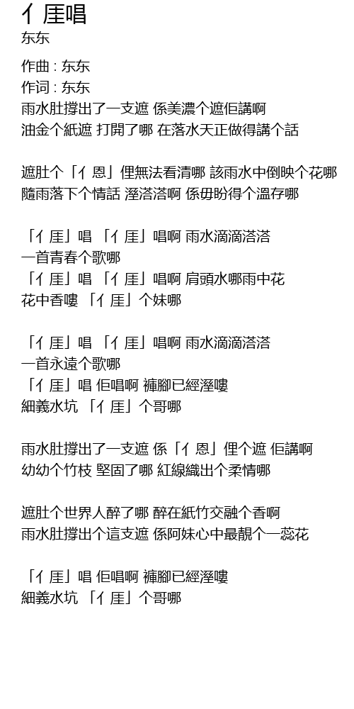 | 雨水肚撐出了一支遮 係「亻恩」俚个遮 佢講啊 | |