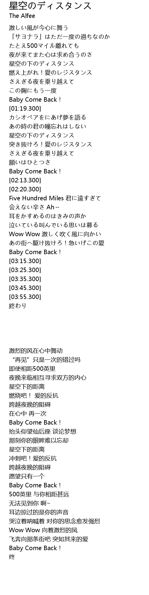 | [02:27.300] | Five Hundred Miles 君に遠すぎて |