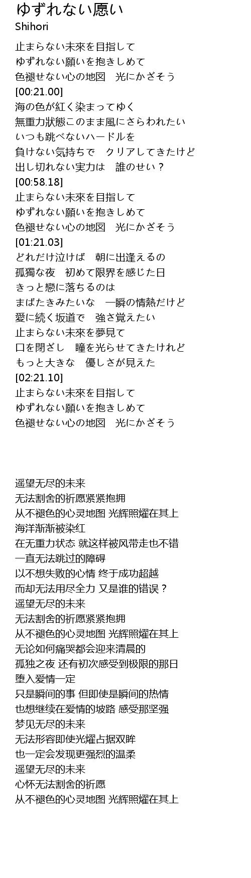 | [00:06.39] | ゆずれない願いを抱きしめて |