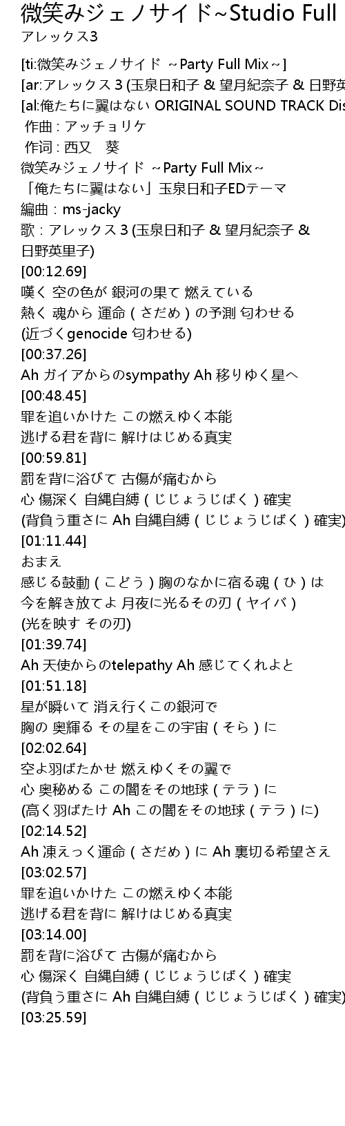 | [00:00.01] | 微笑みジェノサイド ~Party Full Mix~ |