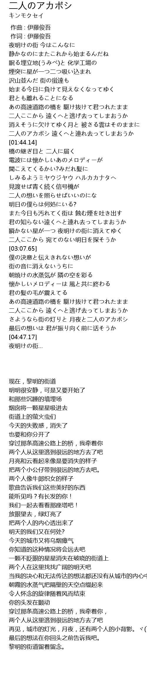 | [04:27.15] | さようなら街の灯りと 月夜と二人のアカボシ |