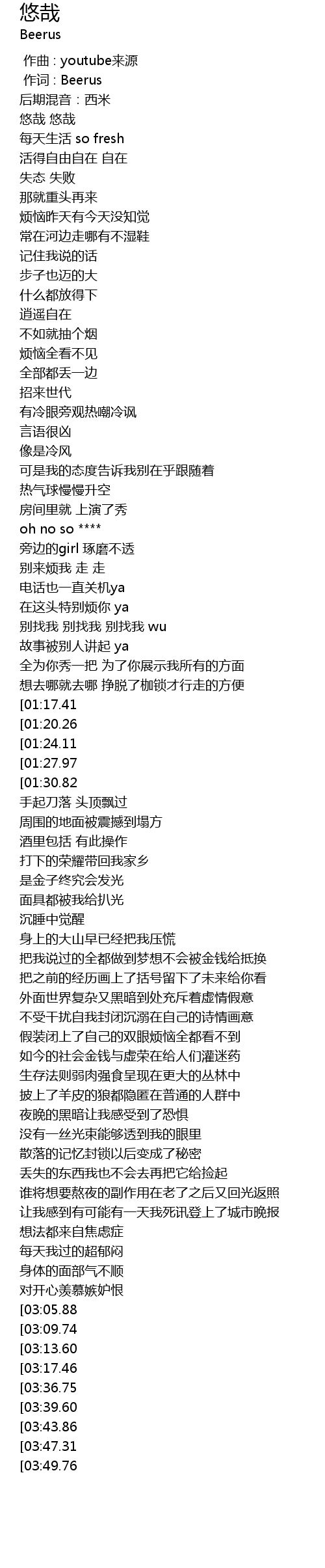 | [01:32.85][01:17.41] | 悠哉 悠哉 |
