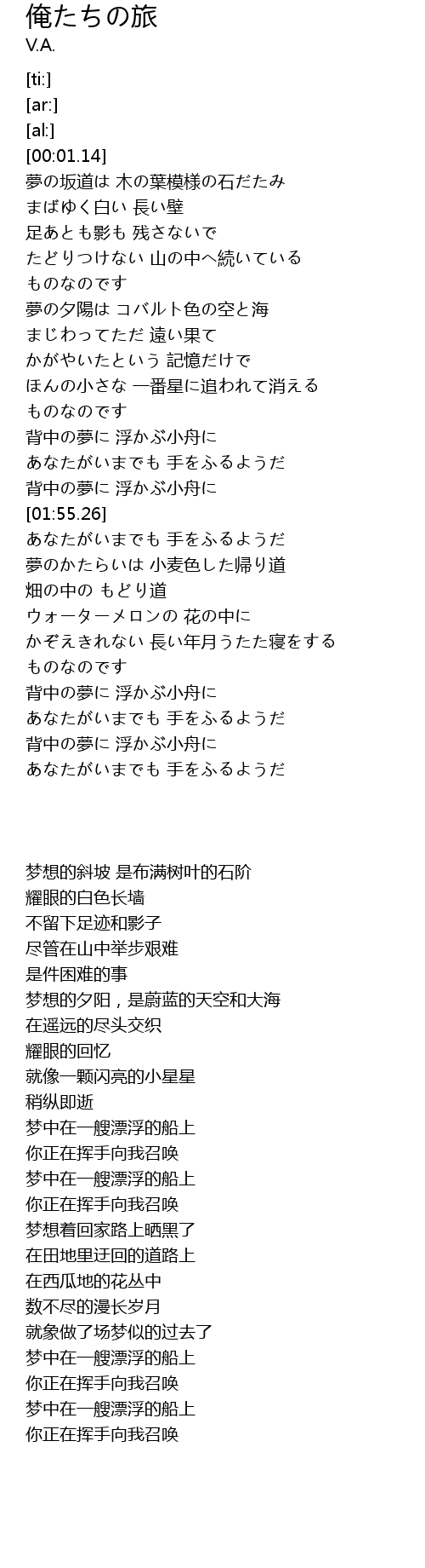 | [01:35.19] | 背中の夢に 浮かぶ小舟に |