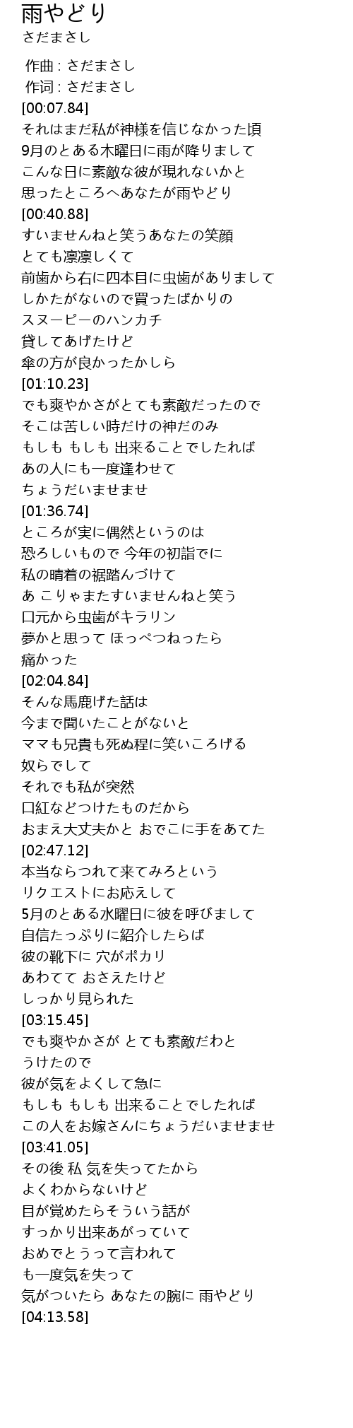 | [04:07.65] | 気がついたら あなたの腕に 雨やどり |