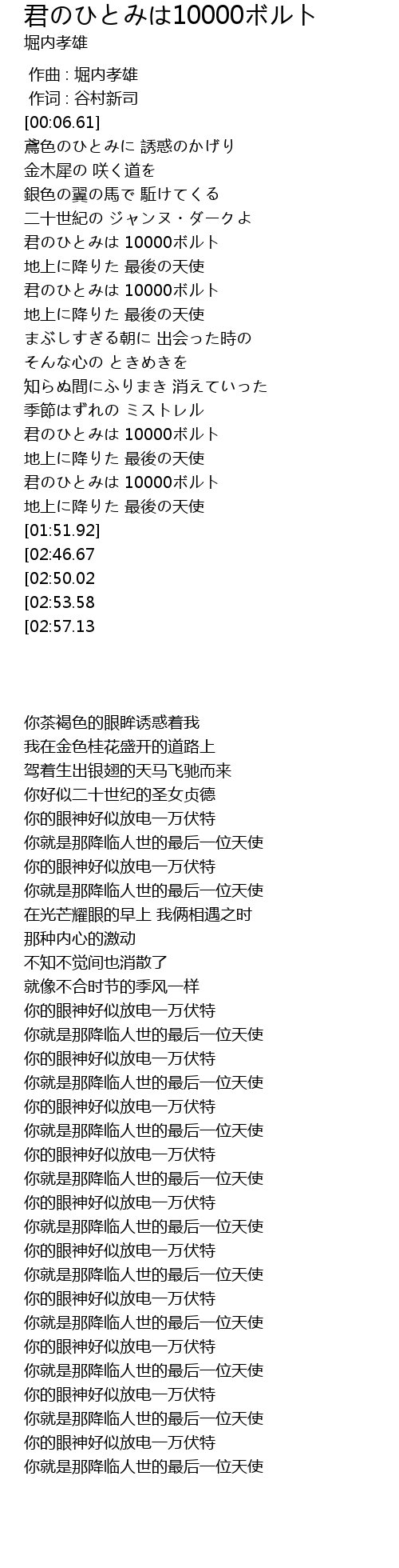 | [03:04.36][02:46.67][02:28.90][02:07.44] | 君のひとみは 10000ボルト |