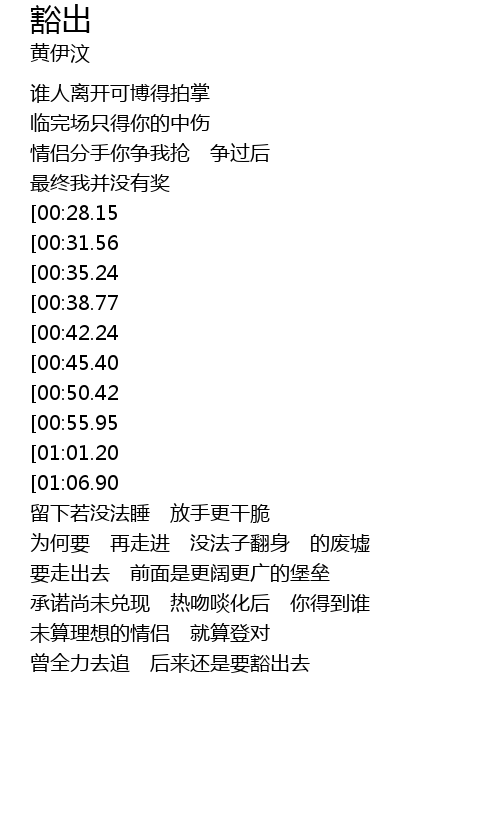 | [02:00.32][01:06.90] | 从来没赞许 未来便学会豁出去 |