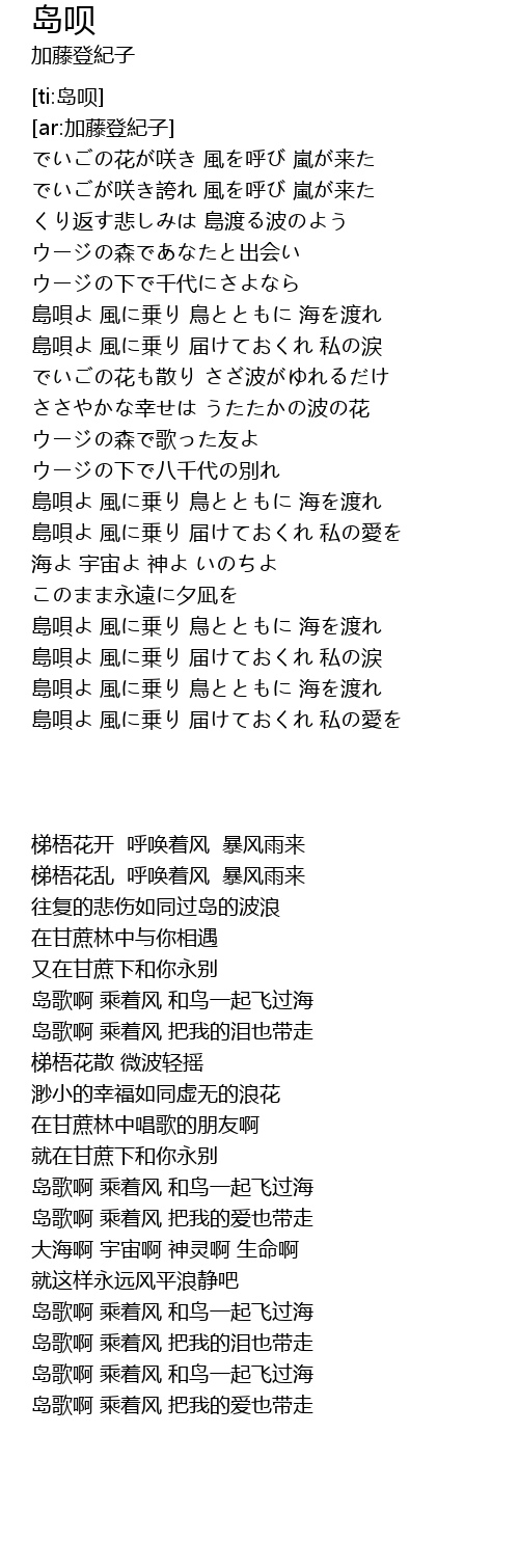 | [03:13.62] | 島唄よ 風に乗り 鳥とともに 海を渡れ |