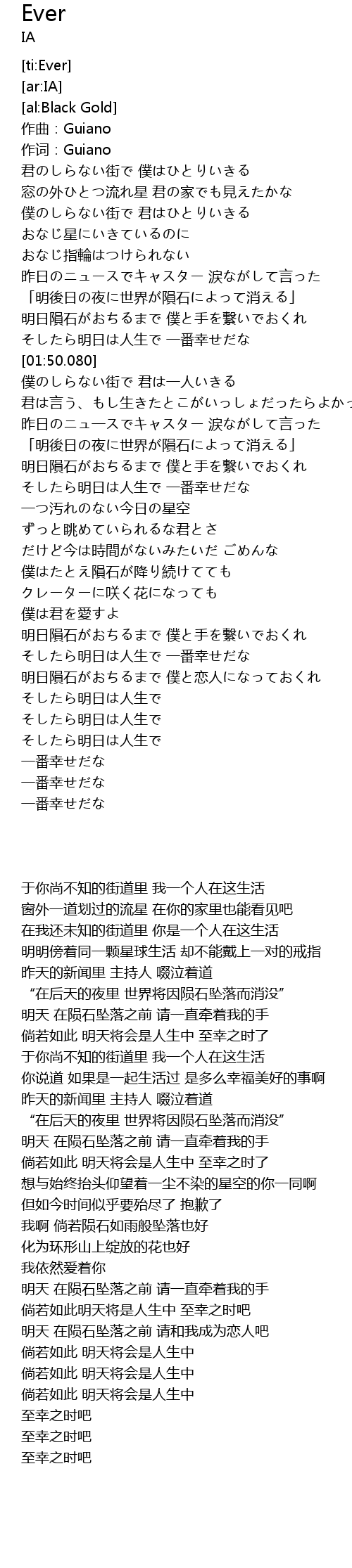 | [03:40.450] | 明日隕石がおちるまで 僕と手を繋いでおくれ |
