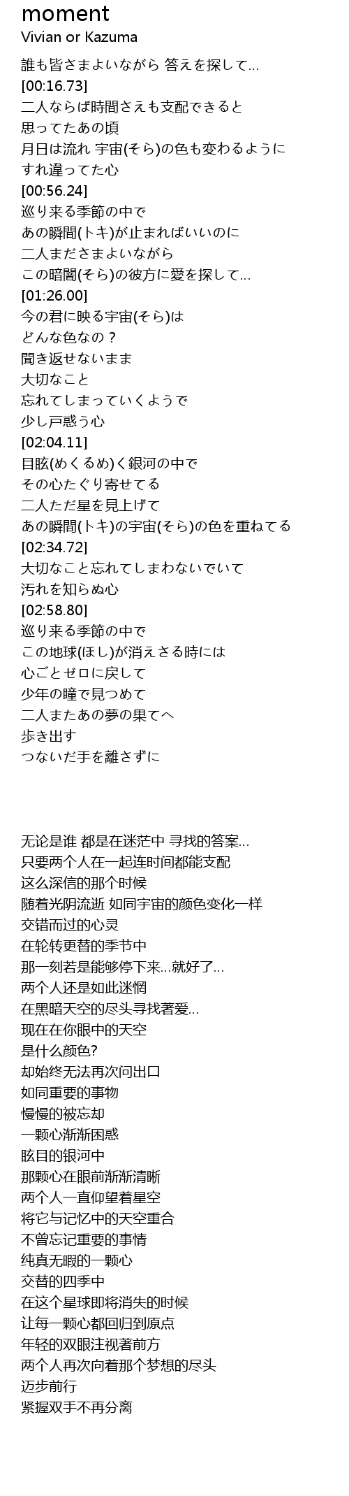| [02:24.11] | あの瞬間(トキ)の宇宙(そら)の色を重ねてる |