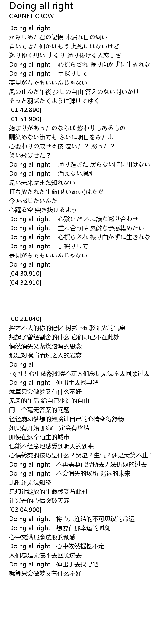 | [04:03.780] | Doing all right! 心揺らされ 振り向かずに生きれない |