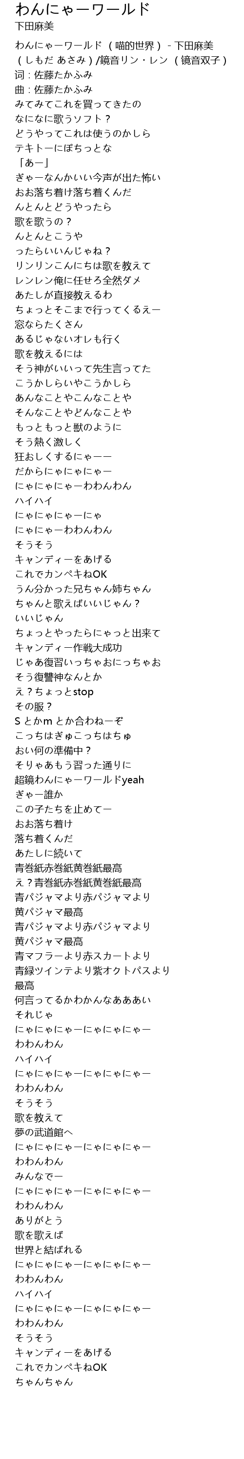 | [00:00.100] | わんにゃーワールド (喵的世界) - 下田麻美 (しもだ あさみ)/鏡音リン・レン (镜音双子) |
