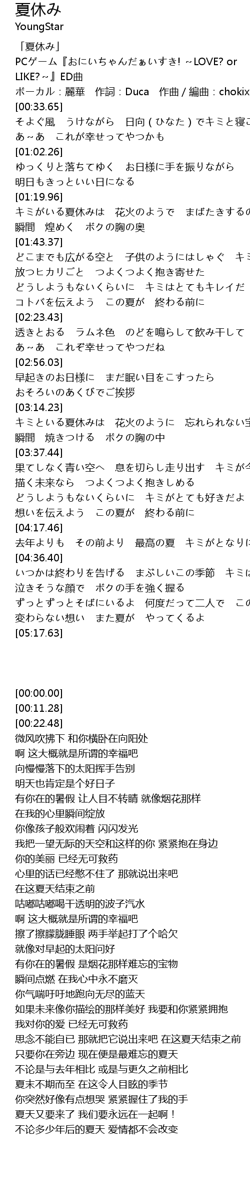 | [00:11.28] | PCゲーム『おにいちゃんだぁいすき! ~LOVE? or LIKE?~』ED曲 |