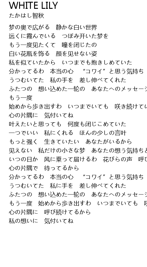 | [03:44.900] | ふたつの 想い込めた一轮の あなたへのメッセージ どうか伝えて |