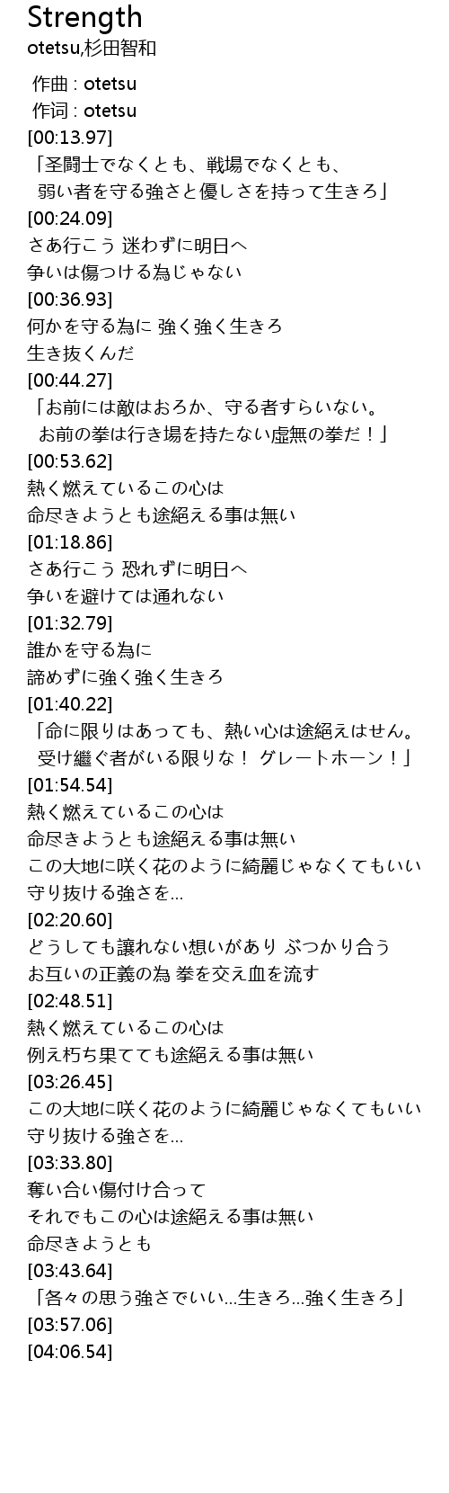 | [00:38.13] | 何かを守る為に 強く強く生きろ |