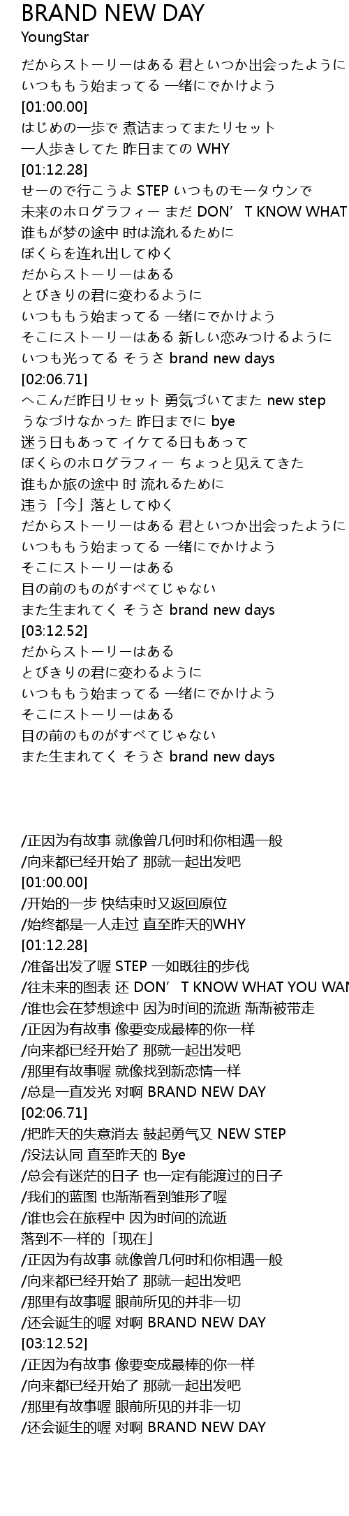 | [01:59.99] | いつも光ってる そうさ brand new days |