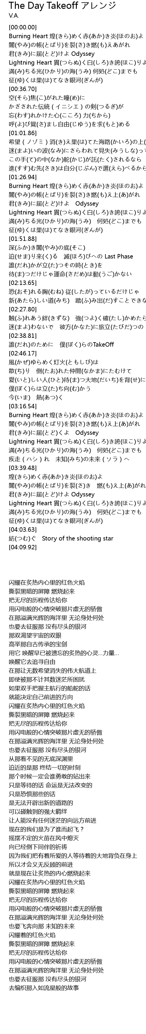 | [03:41.94] | 闇(やみ)の帳(とばり)を裂(さ)き 燃(も)え上(あ)がれ |