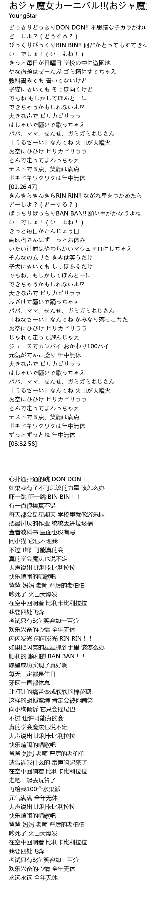 | [00:22.22] | びっくりびっくりBIN BIN!! 何だかとってもすてきね いーでしょ!(いーよね!) |