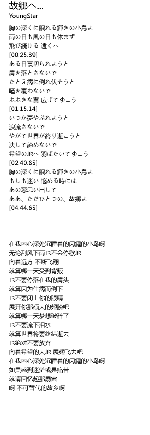 | [04:36.50] | ああ、ただひとつの、故郷よ—— |