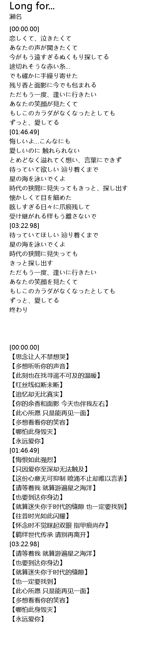 | [00:39.32] | 今がもう遠すぎるぬくもり探してる |