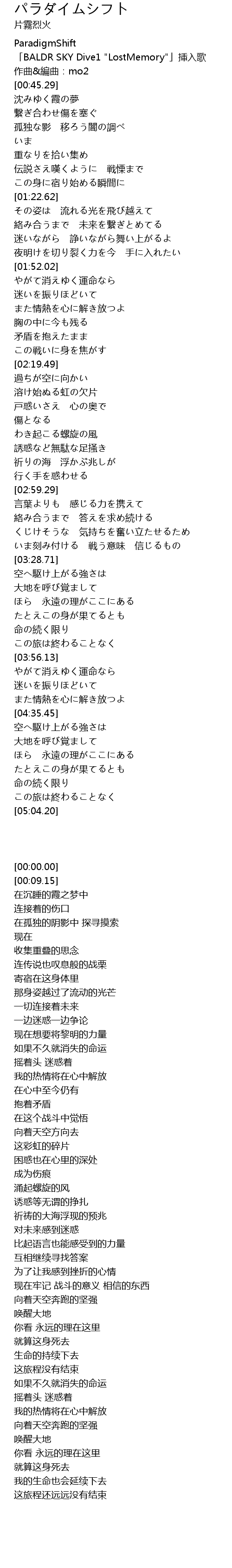 | [00:09.15] | 「BALDR SKY Dive1 "LostMemory"」挿入歌 |