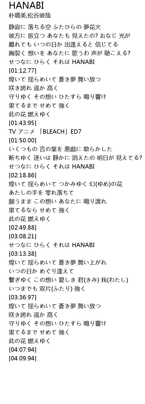 | [03:10.21] | せつなに ひらく それは HANABI |