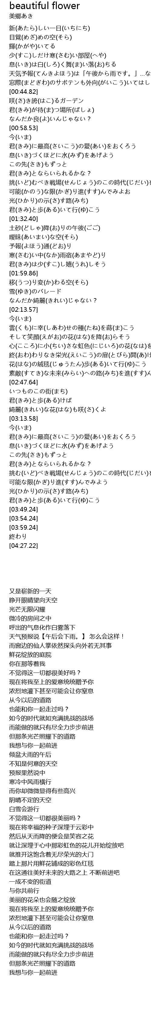 | [03:08.35] | 綺麗(きれい)な花(はな)も咲(さ)くよ |