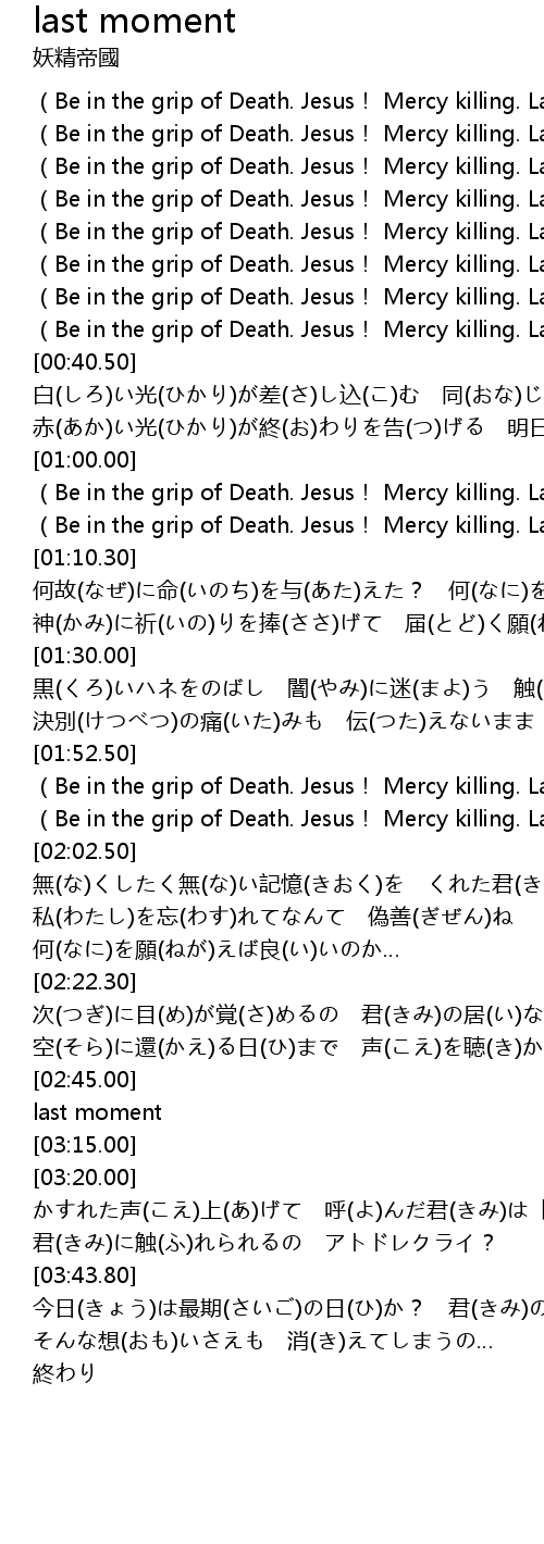 | [00:20.59] | (Be in the grip of Death. Jesus! Mercy killing. Last moment. ) |