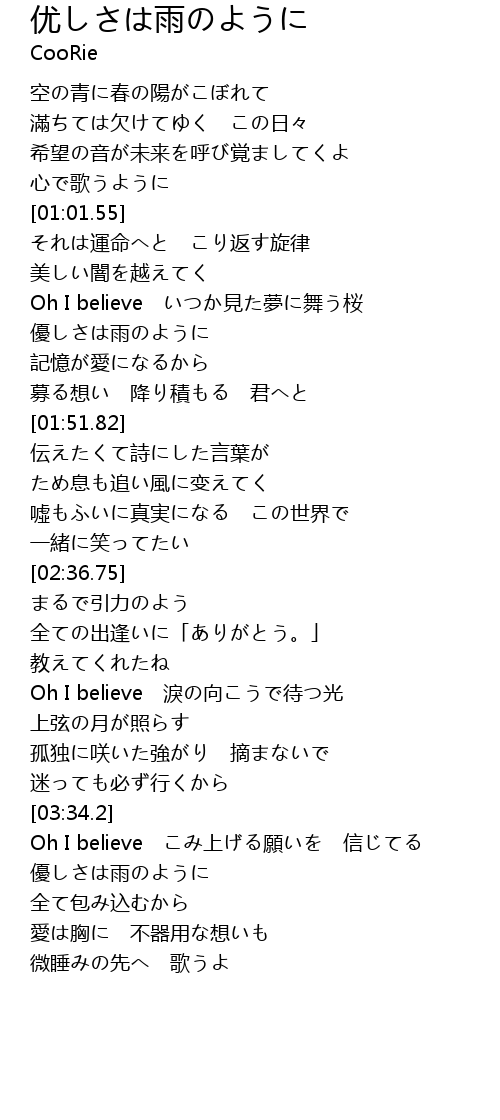 | [02:55.46] | Oh I believe 淚の向こうで待つ光 |