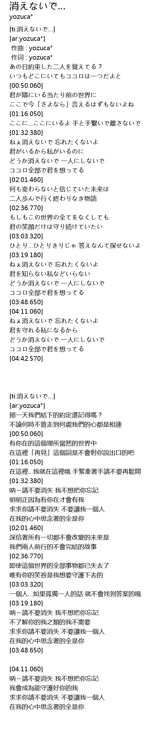 | [04:14.060] | ねぇ消えないで 忘れたくないよ |