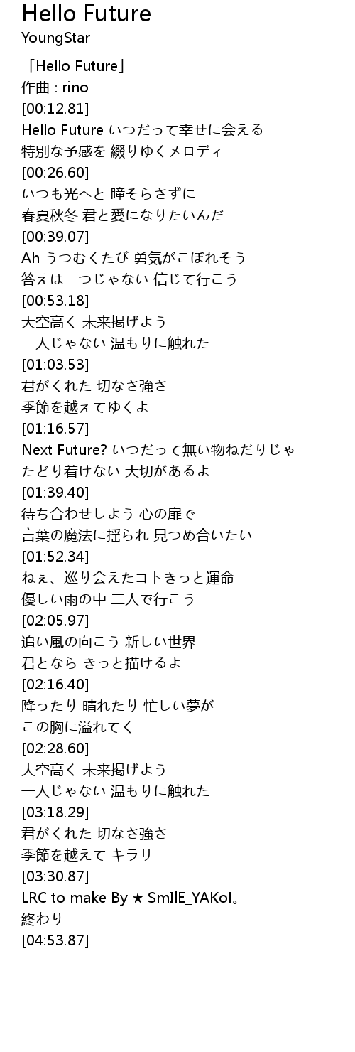 | [00:14.81] | Hello Future いつだって幸せに会える |