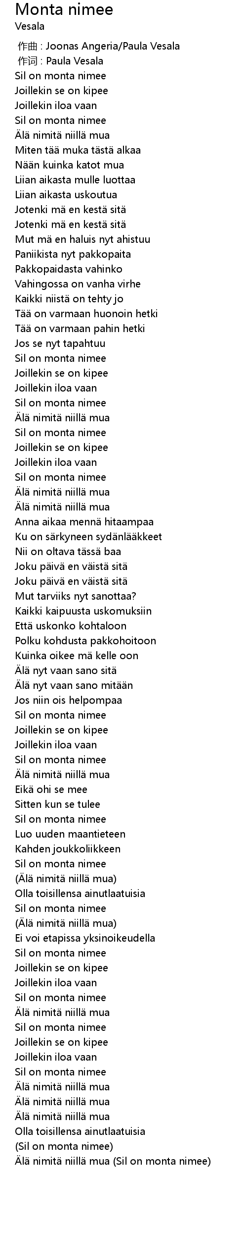 | [00:00.335] | 作词 : Paula Vesala |