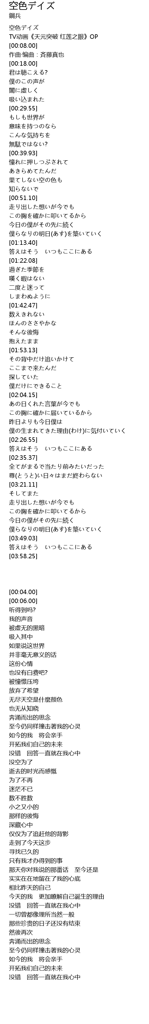 | [00:06.00] | TV动画《天元突破 红莲之眼》OP |