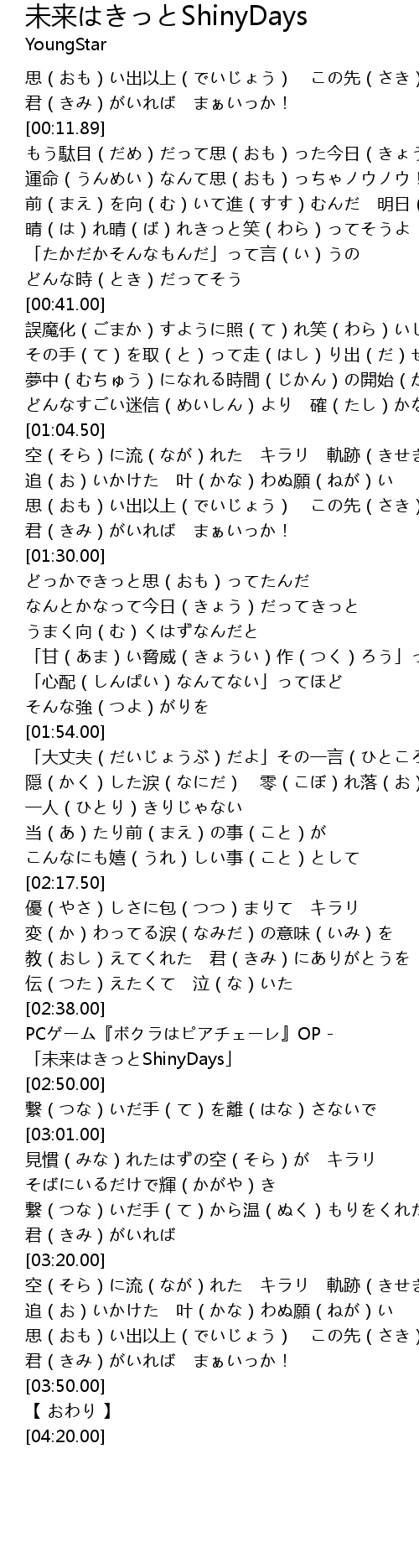| [02:40.00] | PCゲーム『ボクラはピアチェーレ』OP - 「未来はきっとShinyDays」 |