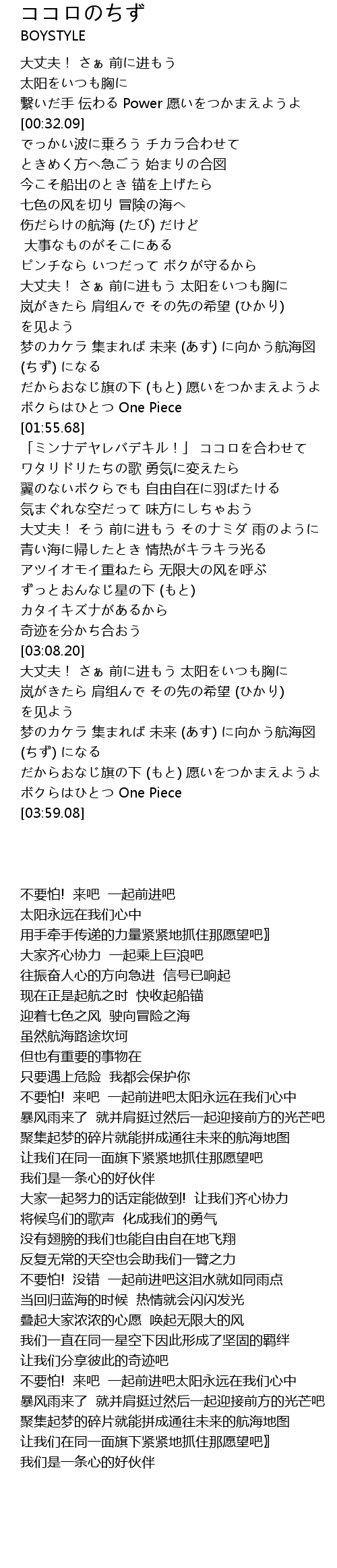 | [03:42.74] | 梦のカケラ 集まれば 未来 (あす) に向かう航海図 (ちず) になる |