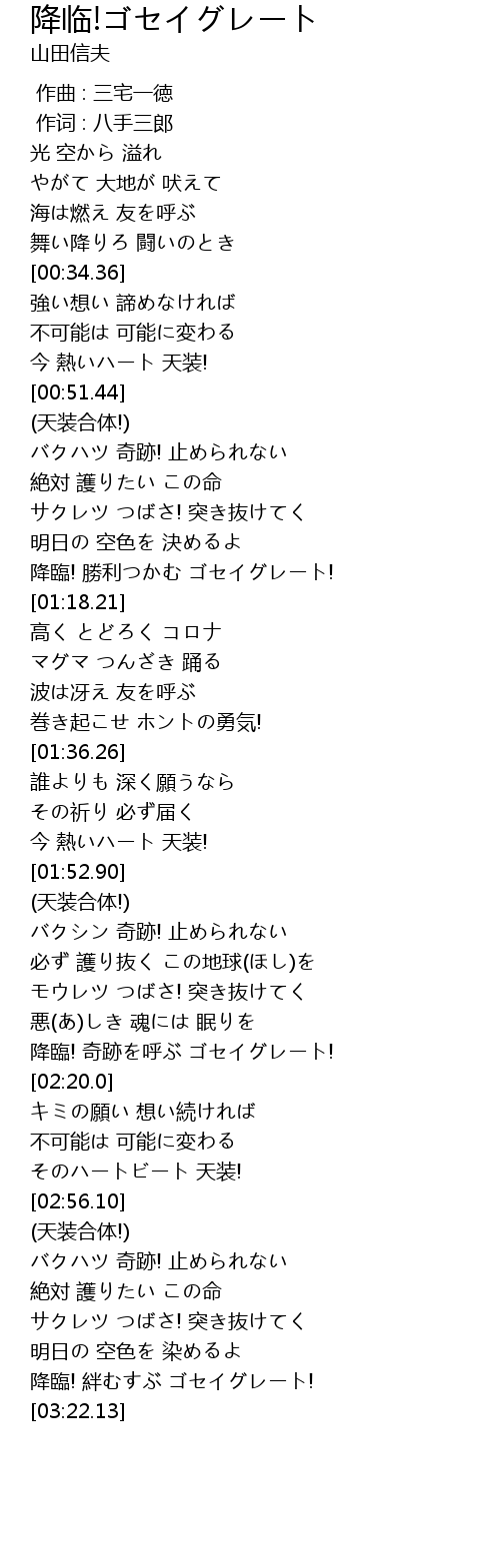 | [02:13.85] | 降臨! 奇跡を呼ぶ ゴセイグレート! |
