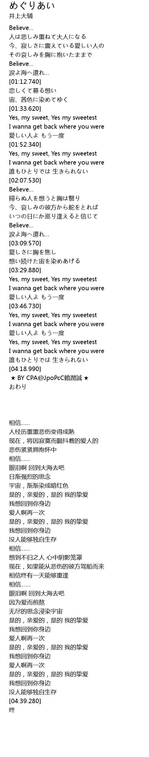 | [02:56.080] | いつの日にか巡り逢えると信じて |